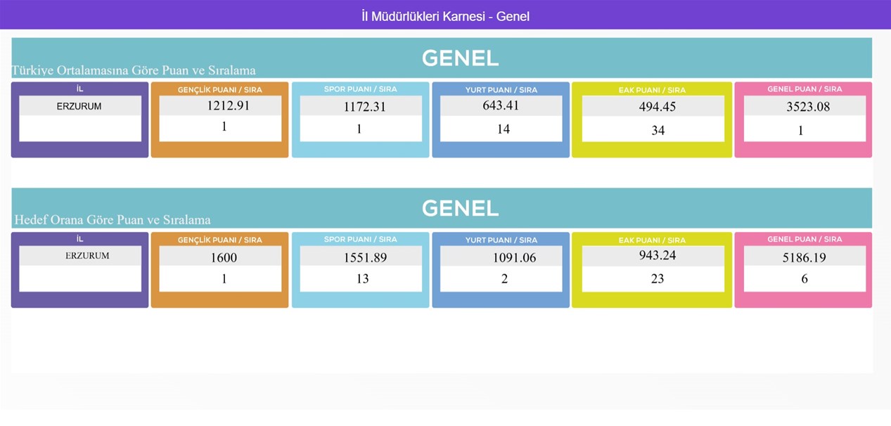 Bu arada Aralık ayının son haftası itibariyle Erzurum, GSB’nin il karnesi değerlendirmesinde 81 il içerisinde sporda ve gençlik hizmetlerinde birinci sırada yer alırken, yurt hizmetlerinde on dördüncü, eğitim faaliyetlerinde otuz dördüncü sırada yer aldı.